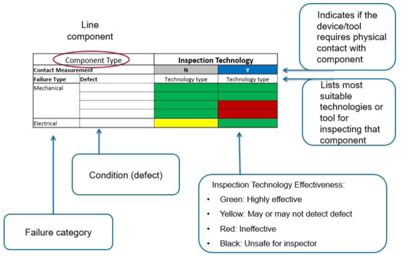 These table present common detectable defects with corresponding inspection technologies. Selection of the most suitable technology is based on a simple “H”, “M”, “L” scheme for a given component condition: L indicates not effective; H indicates the most effective option; and M indicates a possibility of a false positive or false negative result.